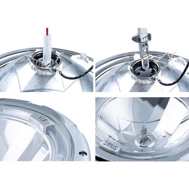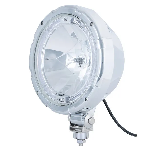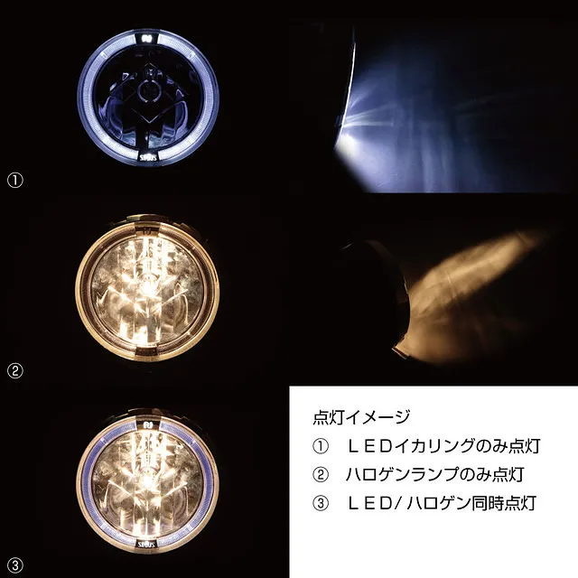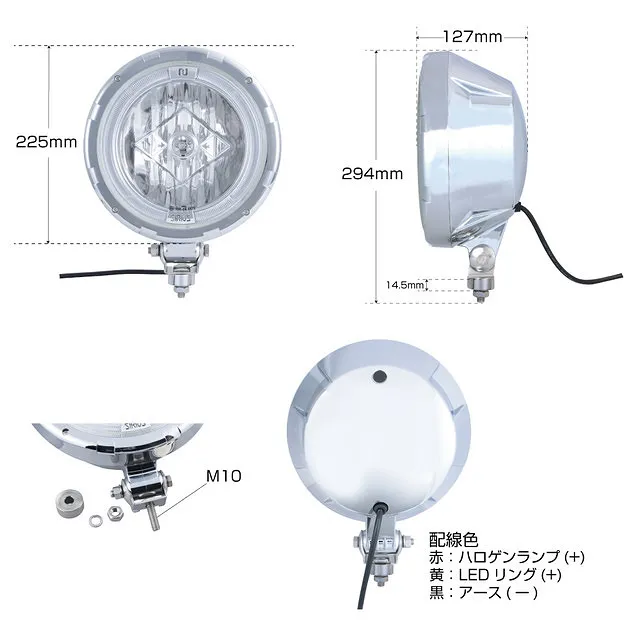 アクセサリー要素満載な9インチハロゲンランプ。ボディはメッキ、LEDイカリングはホワイト。ハロゲンランプにはH1/24V・70Wタイプを付属。