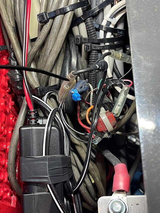 配線は下におろしていくのでヘッドガードのフレームに沿って座席下の電源までもっていきます。