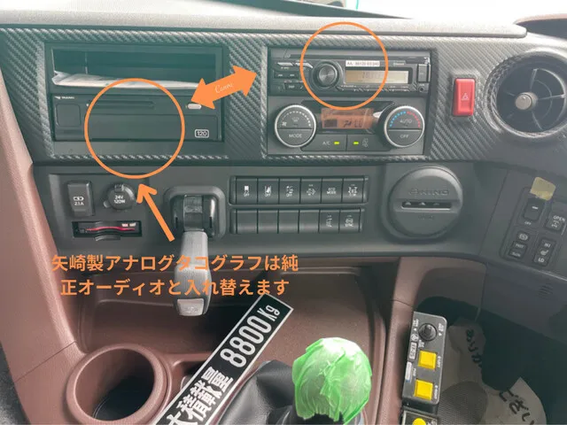 矢崎製アナログタコグラフが取付いていたので右側の純正オーディオと入れ替えを行います。