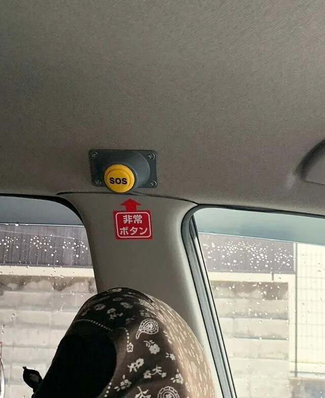 下車確認ボタン(赤)は車両後方に、非常ボタン(黄)は助手席側のピラー上のルーフ部分に取り付けていきます!フェルト生地の部分に取付けるので微調整しながらビス止めします!