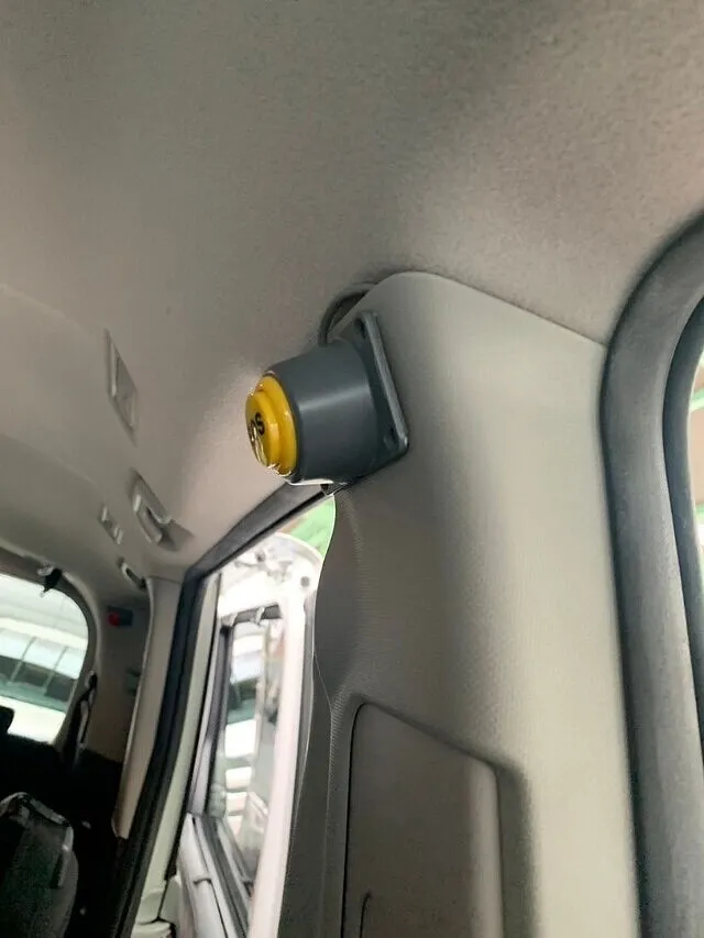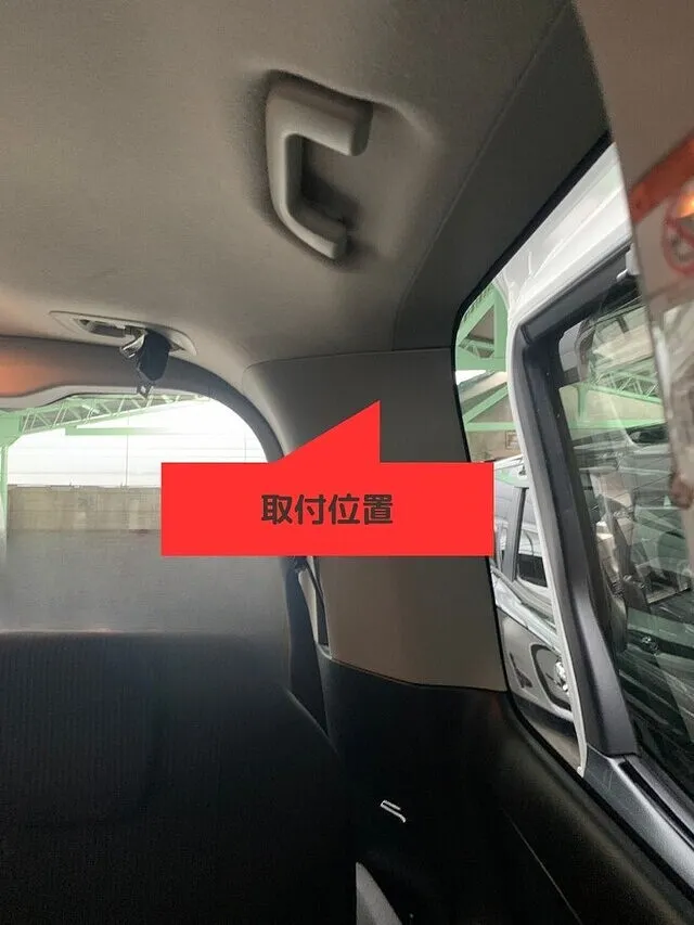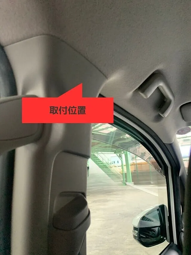 下車確認ボタン(赤)は車両後方のピラー部分に取り付け、非常ボタン(黄)は助手席側のピラーに取り付けていきます!