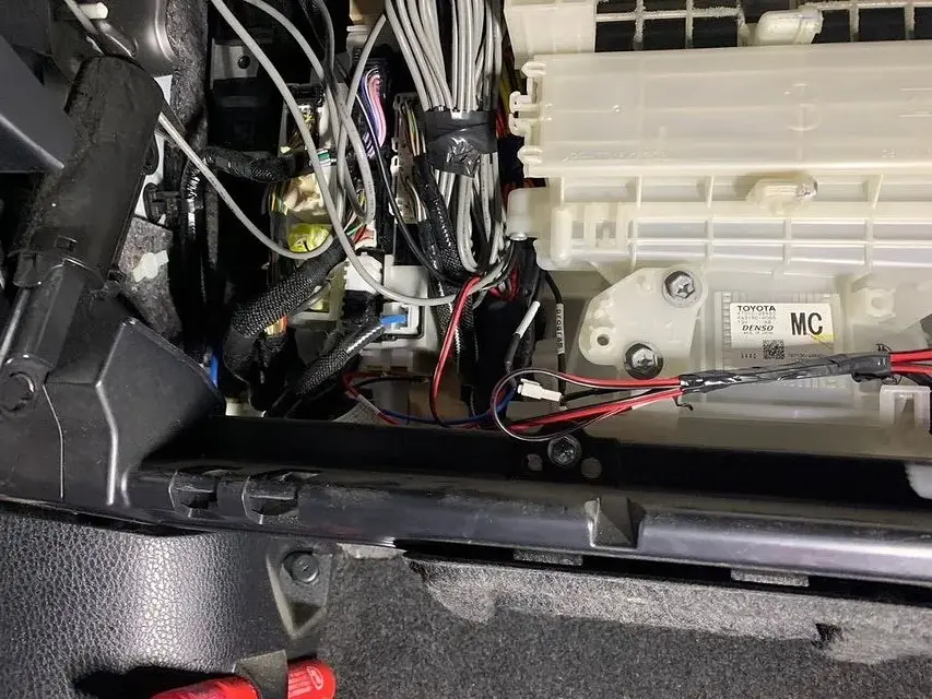 全ての配線がグローブボックス裏まで通ったら、ビニルテープでまとめて収納していきます。