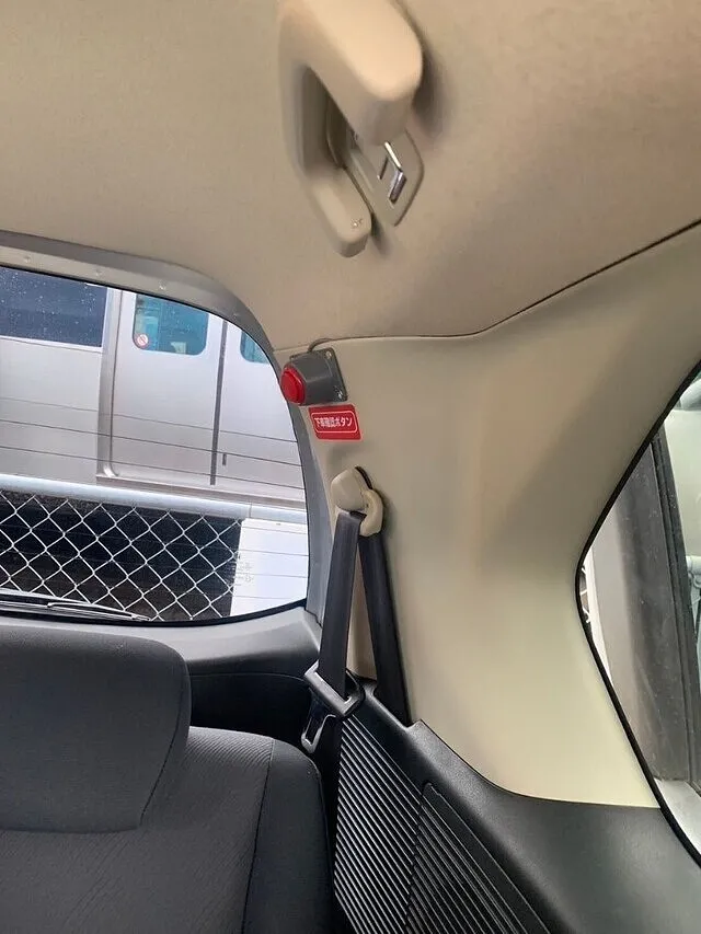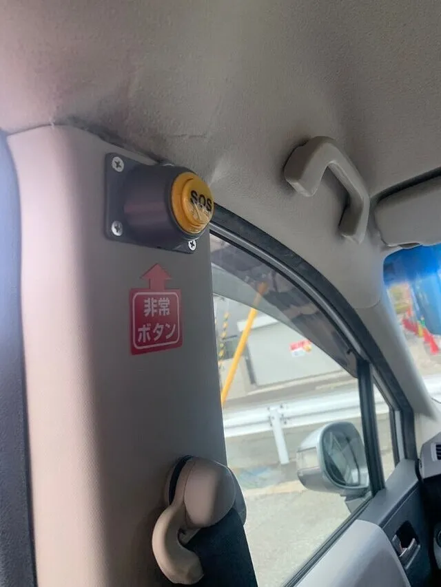 下車確認ボタン(赤)は車両後方のピラー部分に取り付け、非常ボタン(黄)は助手側のピラーに取り付けていきます!