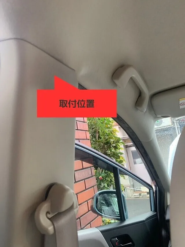 下車確認ボタン(赤)は車両後方のピラー部分に取り付け、非常ボタン(黄)は助手側のピラーに取り付けていきます!配線はルーフとピラーの境目の部分の隙間に配線を通します。