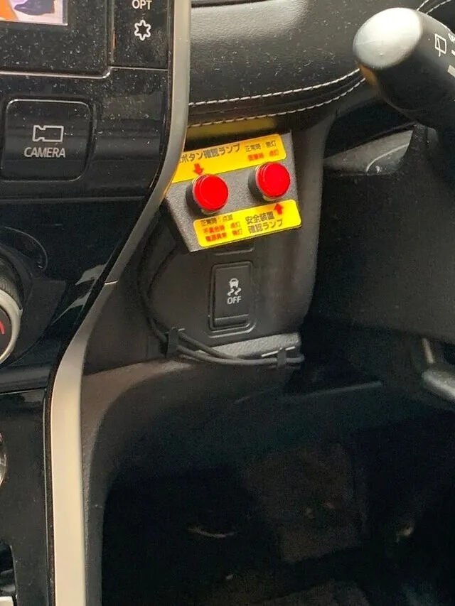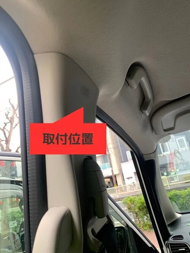 下車確認ボタン(赤)は車両後方のピラー部分に取り付け、非常ボタン(黄)は助手席側のピラーに取り付けます!配線はルーフとピラーの境目部分の隙間に通します。通していく際ドアがあるのでウェザーストリップ(ドアパッキン)を一度外し隙間に配線をいれて戻します。配線が車両前方まで来たらフロントピラーからグローブボックス裏まで通します。
