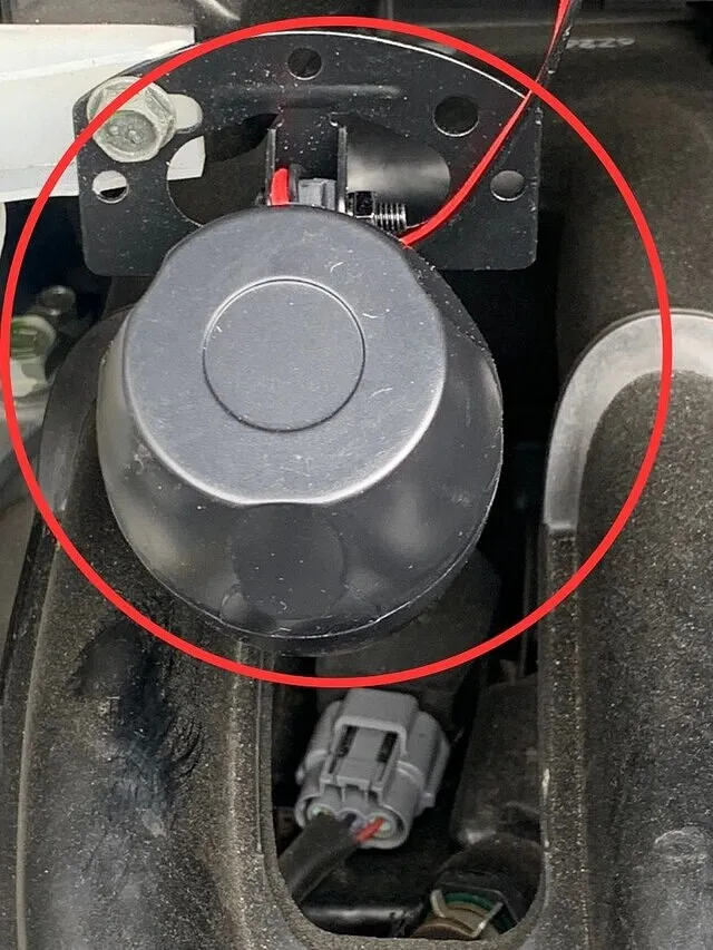 車外警報機はボンネット内部にある既存のボルトを使用して取り付けました。車外警報機のスピーカー部分は防水仕様ではないので、水や油などが入らないように必ず下向きに設置します。